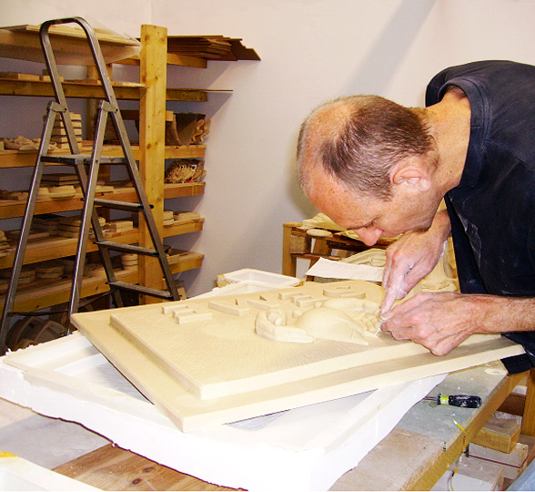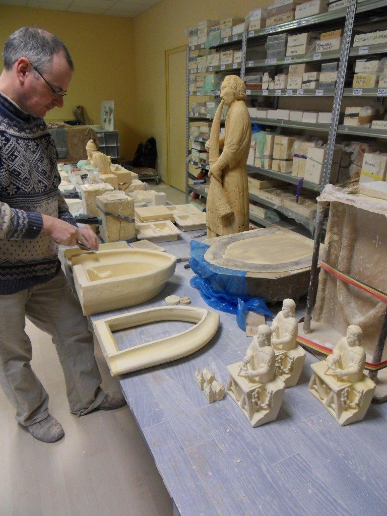 Inspiré des cathédrales et des monuments historiques de France et d’ailleurs, nous sculptons nos modèles dans la pierre pour ensuite les reproduire en pierre reconstituée (mélange de poudre de pierre, sable chaux et pigments naturels). Nous apportons une touche finale en recouvrant d’une patine à l’argile, à la cire d’abeille ou en polychromie avec des pigments de couleurs naturels.